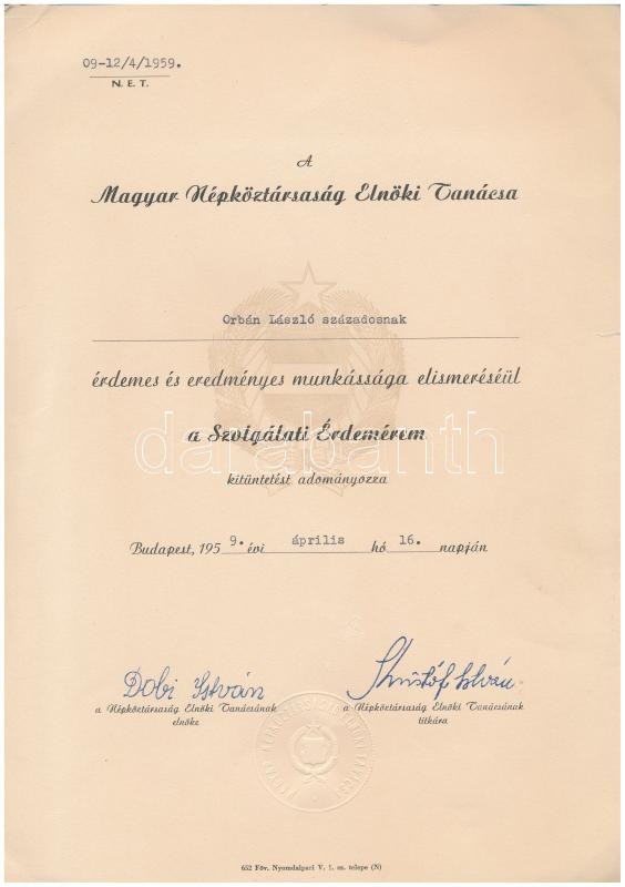 1959. ‘Szolgálati Érdemérem’ névre szóló adományozói okirata ‘Magyar Népköztársaság Elnöki Tanácsa’ szárazpecséttel T:2 kis szakadás<a href="https://www.darabanth.com/hu/gyorsarveres/433/kategoriak~Numizmatika/Militaria~2000004/1959-Szolgalati-Erdem