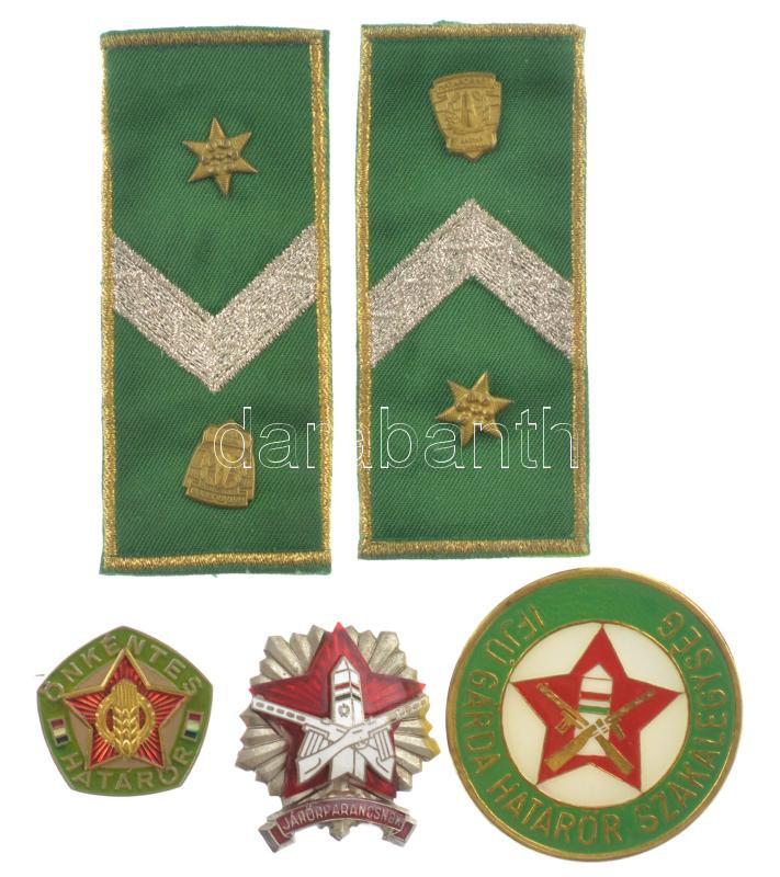 ~1960 ‘Járőrparancsnok’ műanyag – fém kompozit, zománcozott és műgyantás szolgálati jelvény (41x39mm) + ‘Határőrség – Magyar Köztársaság’ őrmesteri vállap állományjelvénnyel (2x) (94x40mm) + ‘Önkéntes határőr’ krómozott, festett szolgálati jelvény (30x30m