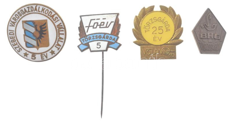 ~1965. ‘Szegedi Városgazdálkodási Vállalat 5 év’ zománcozott tombak tözsgárda jelvény (26mm) + ‘FÓÉV (Fővárosi Óra Ékszer Vállalat) törzsgárda 5’ zománcozott Cu jelvény (16x19mm) + ‘BHG (Budapesti Híradástechnikai Gépgyár) tözsgárda’ Cu jelvény (20x16mm)