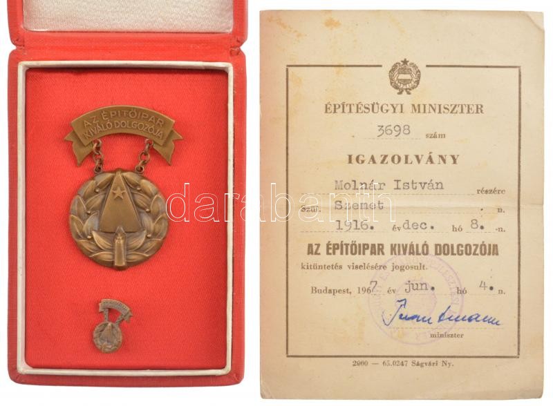 1968. ‘Az Építőipar Kiváló Dolgozója’ bronz kitüntetés, miniatűrrel, tokban, igazolvánnyal, az igazolványon Trautmann Rezső miniszter, az az Elnöki Tanács elnökhelyettesének aláírásával T:1<a href="https://www.darabanth.com/hu/gyorsarveres/435/kateg