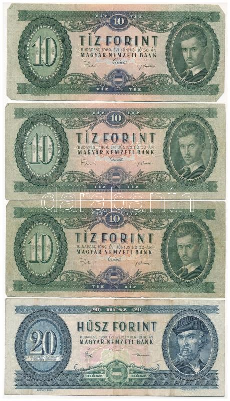 1969. 10Ft (3x) + 1980. 20Ft T:III,III-<a href="https://www.darabanth.com/hu/gyorsarveres/417/kategoriak~Numizmatika/Magyar-bankjegyek~2000007/1969-10Ft-3x-plus-1980-20Ft-TIII-III-~II2625951/?utm_source=affiliate&utm_medium=mutargy&utm_campaign=alla