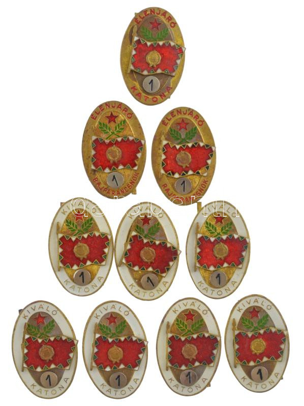 ~1970-1980. ‘Élenjáró Katona – 1’ zománcozott fém sapkajelvény, Magyar Néphadsereg (7db) + ‘Kiváló Katona – 1’ zománcozott fém sapkajelvény, Magyar Néphadsereg (3db) T:1-,2<a href="https://www.darabanth.com/hu/gyorsarveres/428/kategoriak~Numizmatika