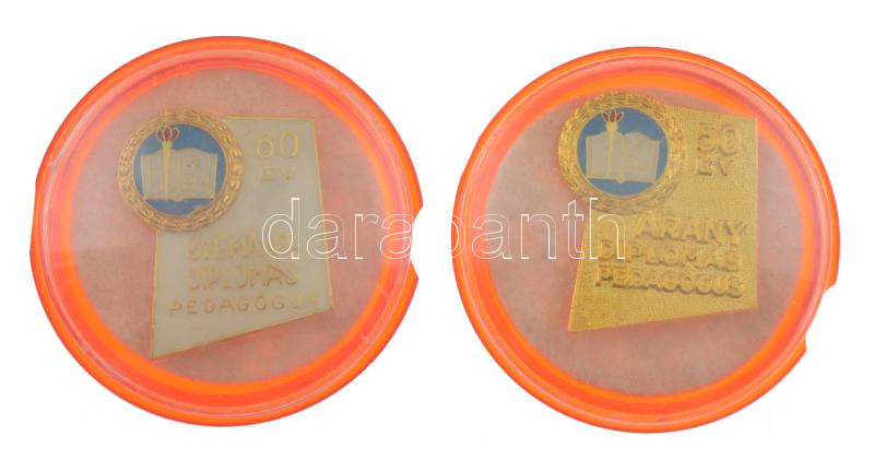 ~1970. ’50 év – Aranydiplomás pedagógus’ aranyozott, műgyantás jelvény műanyag tokban + ’60 év – Gyémántdiplomás pedagógus’ aranyozott, műgyantás jelvény műanyag tokban T:vegyes<a href="https://www.darabanth.com/hu/gyorsarveres/436/kategoriak~Numizm