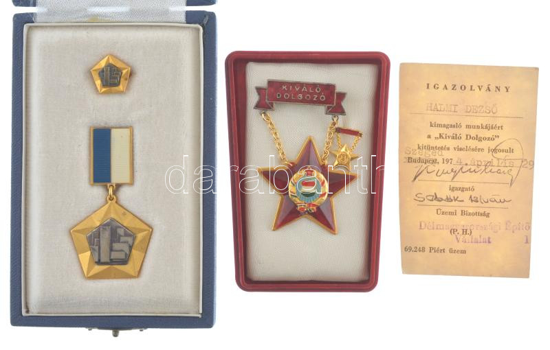 1974. ‘Kiváló Dolgozó’ műanyag – bronz kompozit, rátétes kitüntetés zománcos és műgyantás színezéssel, miniatűrrel, igazolással, dobozban (41x41mm) + Vincze Dénes (1924-1972) ~1978. ‘Az Építőipar kiváló dolgozója’ részben aranyozott, műgyantás miniszteri