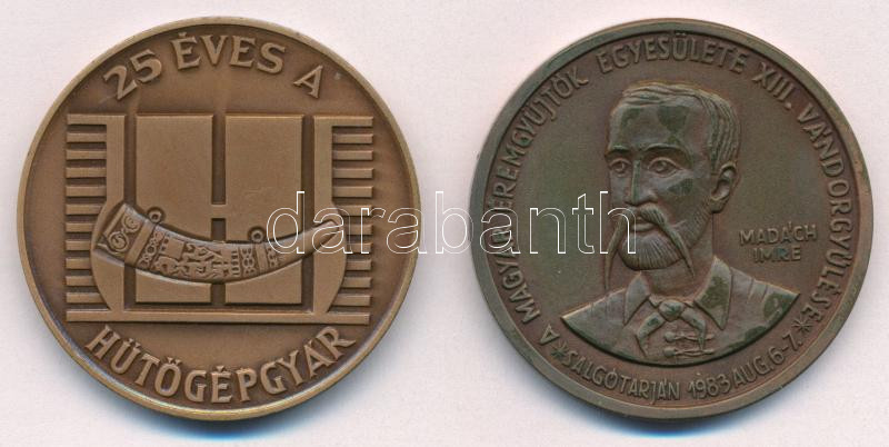 1977. ’25 éves a Lehel hűtőgépgyár / 1952-1977 Jászberény’ bronz emlékérem (42,5mm) + 1983. ‘A Magyar Éremgyűjtők Egyesülete XIII. Vándorgyűlése – Salgótarján – Madách Imre / Az ember tragédiája színpadi bemutatásának 100. évfordulója’ bronz emlékérem (42
