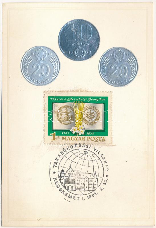 1981. ‘Takarékossági Világnap’ emléklap 10Ft és 20Ft (2x) érmék domború képével, bélyeggel, bélyegzéssel