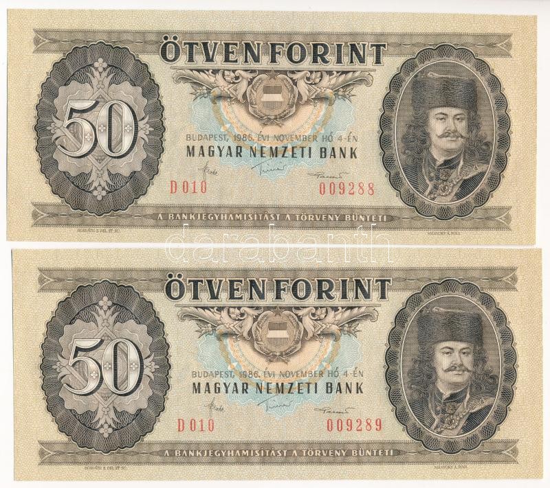 1986. 50Ft (2x) sorszámkövetők ‘D 010 009288 – D 010 009289’ nyomdai papírráncokkal T:I Adamo F24