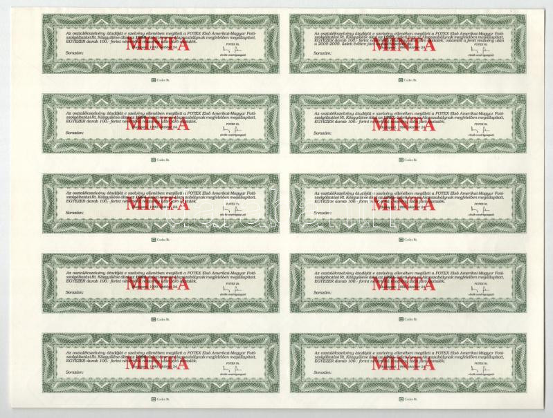 1990-1994. 5 darabos magyar részvény tétel: ‘Fotex’, ‘Első Pesti Hengermalom’, ‘Elmka’, ‘Globex’, ‘Biorex’, közte vízjeles papír, szárazpecsét, ‘MINTA’ pecsét és perforáció, szelvények T:I-,II