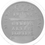 1990. ‘Magyar Csapat 1992 – CITIVS, ALTIVS, FORTIVS / Férfi torna’ a Barcelonában rendezett nyári Olimpia alkalmából készült, jelzetlen Ag emlékérem kapszulában, sorszámozott ‘3629’ tanúsítvánnyal, eredeti dísztokban. Szign.: Papp László (31,5g/0,925/42,5
