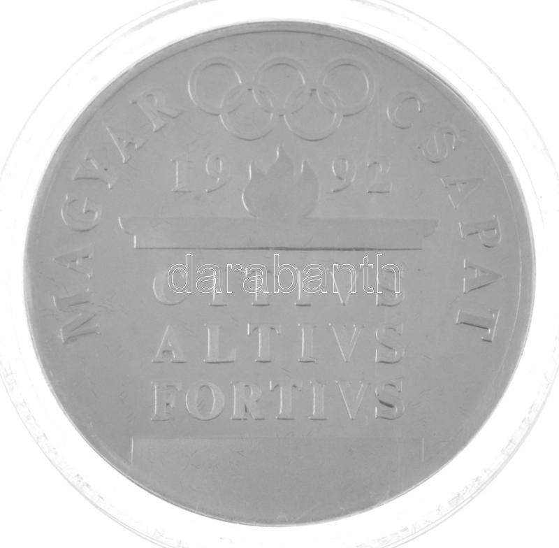 1990. ‘Magyar Csapat 1992 – CITIVS, ALTIVS, FORTIVS / Öttusa’ a Barcelonában rendezett nyári Olimpia alkalmából készült, jelzetlen Ag emlékérem kapszulában, sorszámozott ‘2585’ tanúsítvánnyal, eredeti dísztokban. Szign.: Papp