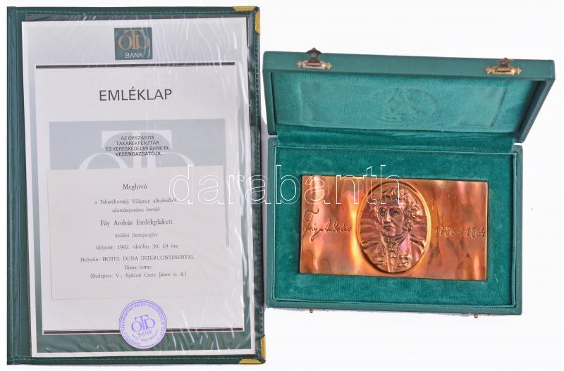 1992. ‘Fáy András 1786-1864 / A Takarékossági Mozgalomban végzett kiváló munkáért’ Br plakett eredeti dísztokban, díszmappában lévő meghívóval és adományozási okirattal (rajta Csányi Sándor aláírásával) (75x143mm) T:1- kis
