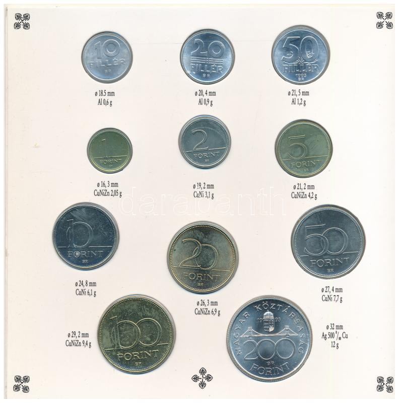 1993. 10f-200Ft (11xklf) forgalmi sor, benne 200Ft Ag ‘MNB’, ‘Magyarország pénzérméi’ karton dísztokban, belső tok ragasztása kissé elengedett T:BU patina Adamo FO26<a href="https://www.darabanth.com/hu/gyorsarveres/440/kategoriak~Numizmatika/Magyar