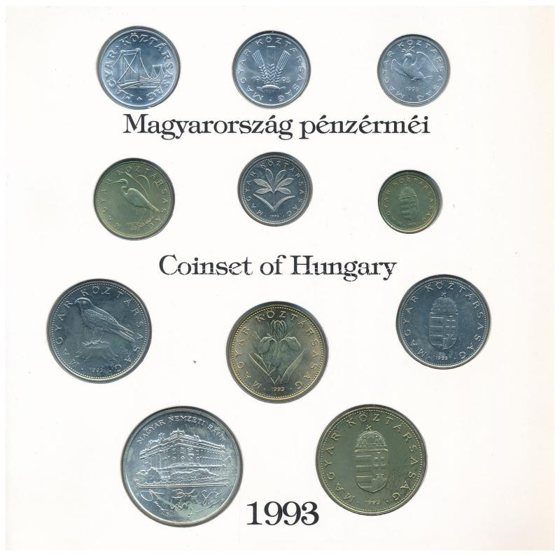 1993. 10f-200Ft (11xklf) forgalmi sor, benne 200Ft Ag ‘MNB’, ‘Magyarország pénzérméi’ karton dísztokban T:BU patina, a karton díszlap sérült, két oldala hiányzik Adamo FO26