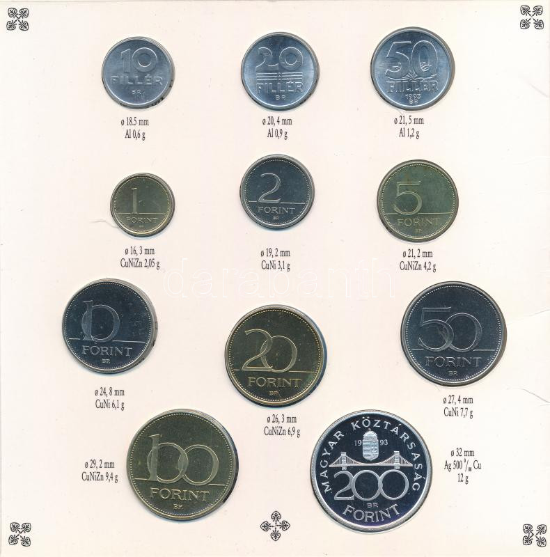 1993. 10f-200Ft (11xklf) forgalmi sor dísztokban, benne 200Ft Ag ‘MNB’ T:PP Adamo FO26.3