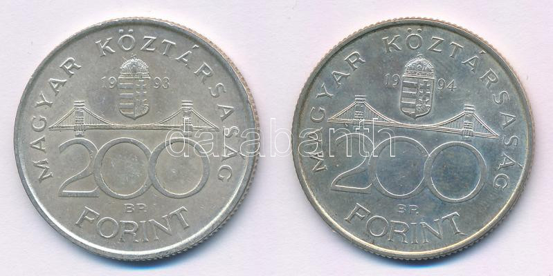 1993. 200Ft Ag ‘MNB’ + 1994. 200Ft Ag ‘Deák’ T:AU,XF patina Adamo F13, F13.1<a href="https://www.darabanth.com/hu/gyorsarveres/439/kategoriak~Numizmatika/Magyar-es-magyar-verdejelu-fem-es-ezustpenzek~500008/1993-200Ft-Ag-MNB-plus-1994-200Ft-Ag-Deak-