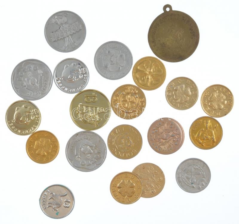 19db-os újévi szerencsepénz és Lottó zseton tétel + DN ‘Sárkányölő Szent György’ fém érem füllel T:vegyes<a href="https://www.darabanth.com/hu/gyorsarveres/423/kategoriak~Numizmatika/Papir-es-fem-szuksegpenzek~6000006/19db-os-ujevi-szerencsepenz-es-