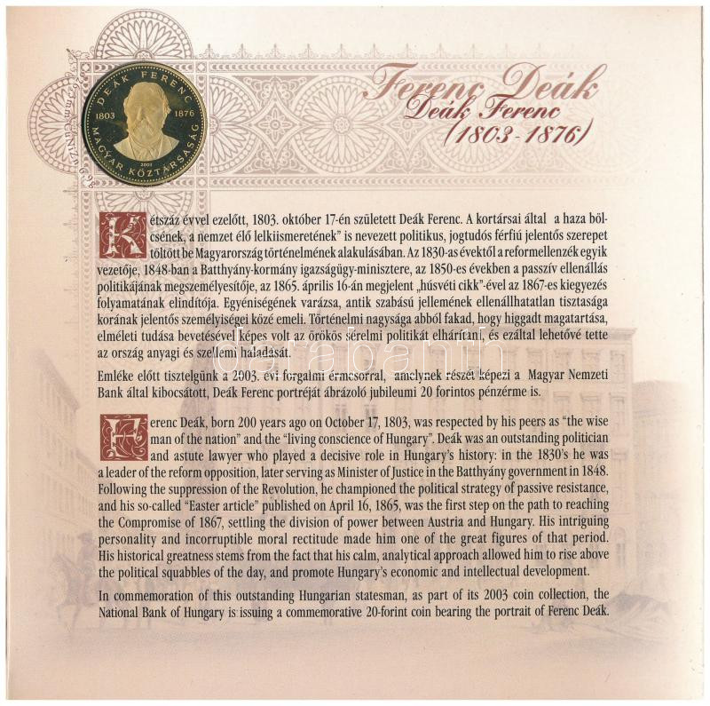 2003. 1Ft-100Ft (7xklf) forgalmi sor szettben + 20Ft ‘Deák Ferenc’ forgalmi emlékérme, T:PP kis patina Adamo FO36.1<a href="https://www.darabanth.com/hu/gyorsarveres/435/kategoriak~Numizmatika/Magyar-es-magyar-verdejelu-fem-es-ezustpenzek~1000008/20