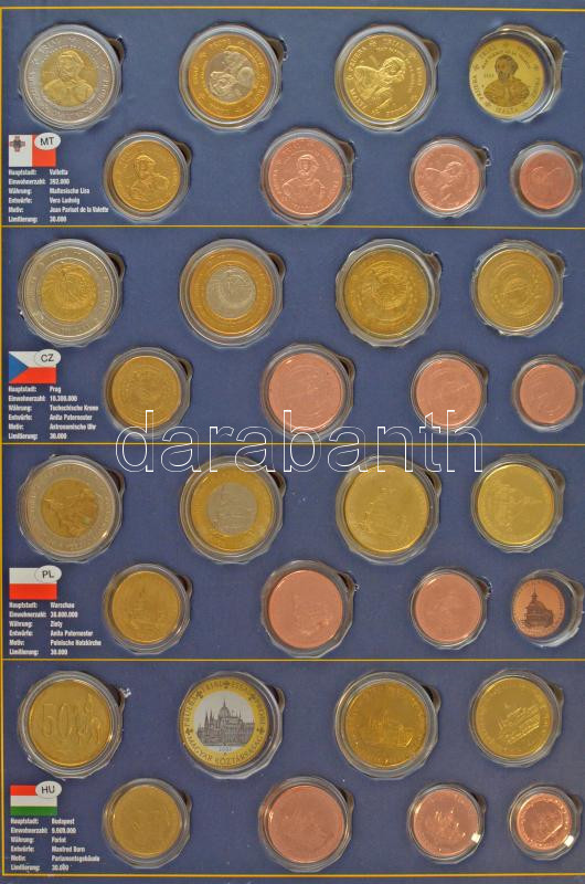 2003. 45xklf Euro érmetervezet/próbaveret. Teljes sorok: Dánia, Svédország, Csehország, Lengyelország. Hiányos sorok: Málta (20c hiányzik), Magyarország (1E és 2E hiányzik) eredeti albumban, összesen 7 ország számára, 56