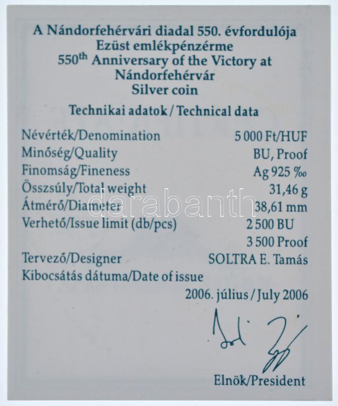 2006. 5000Ft Ag ‘Nándorfehérvári diadal’ kapszulában, tanúsítvánnyal, tájékoztatóval T:PP Adamo EM204<a href="https://www.darabanth.com/hu/gyorsarveres/434/kategoriak~Numizmatika/Magyar-es-magyar-verdejelu-fem-es-ezustpenzek~1500008/2006-5000Ft-Ag-N