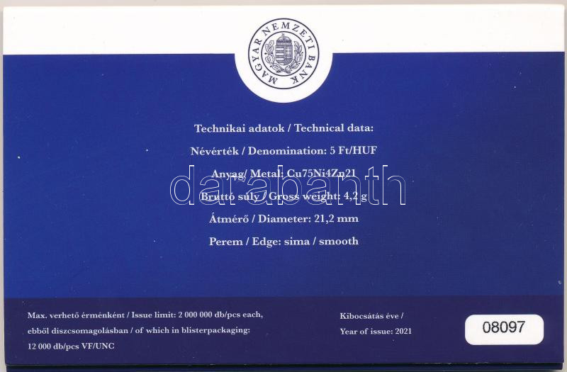 2021. 5Ft Cu-Ni-Zn ’75 éves a Forint’ első napi veret (6xklf) sorszámozott emléklapon ‘08097’ T:1<a href="https://www.darabanth.com/hu/gyorsarveres/434/kategoriak~Numizmatika/Magyar-es-magyar-verdejelu-fem-es-ezustpenzek~1500008/2021-5Ft-Cu-Ni-Zn-75