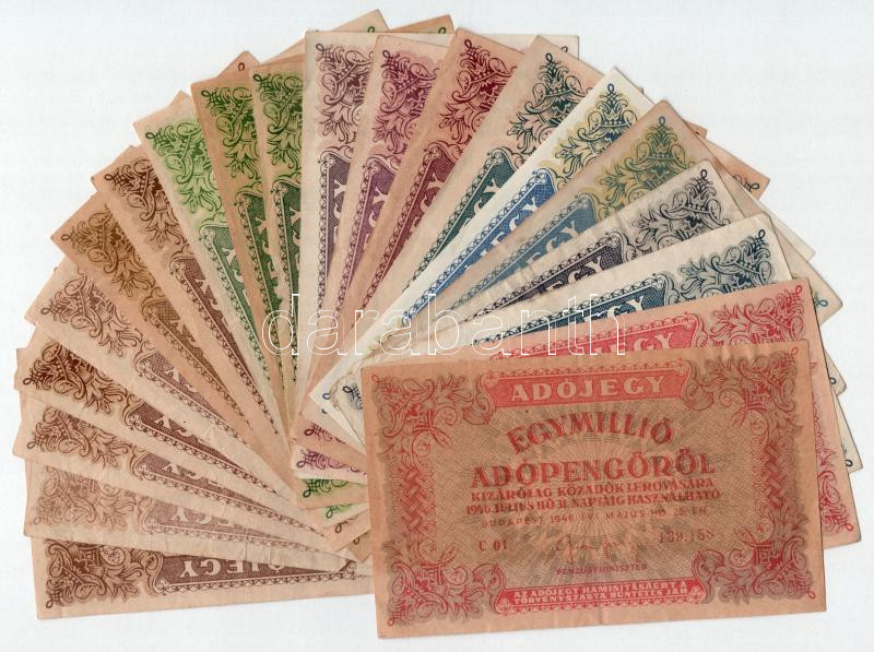 20db-os vegyes adópengő tétel, közte 1946. 1.000.000AP vízjeles papíron, fordított címerrel T:I–III- közte folt, szakadás<a href="https://www.darabanth.com/hu/gyorsarveres/436/kategoriak~Numizmatika/Magyar-bankjegyek~1500007/20db-os-vegyes-adopengo