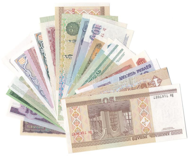21 darabos külföldi bankjegy tétel, nagyrészt a volt szovjet tagköztársaságokból T:I- közte sarokhajlás 21 pieces foreign banknote lot, mainly from ex soviet member republic C:AU include folded corner