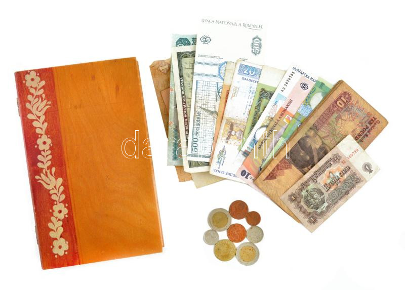 25 darabos vegyes külföldi érem és bankjegy tétel, közte egyiptomi, román és bolgár bankjegyek festett fadobozban. T:vegyes 25 pieces mixed coin and banknote lot, among egyptian, romanian and bulgarian banknotes in a painted wood box C:mixed<a href=