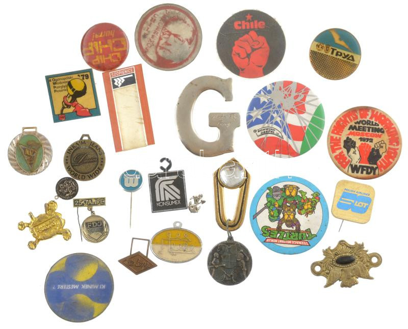 25db-os vegyes magyar és külföldi jelvény tétel, közte ‘Schwinn-Csepel’ , ‘For the Rights of Working Youth-World Meeting Moscow 1972.’ fém, műgyantás fém és műanyag jelvények T:2-3- közte sérült, hiányzó függesztés<a href="https://www.darabanth.com/