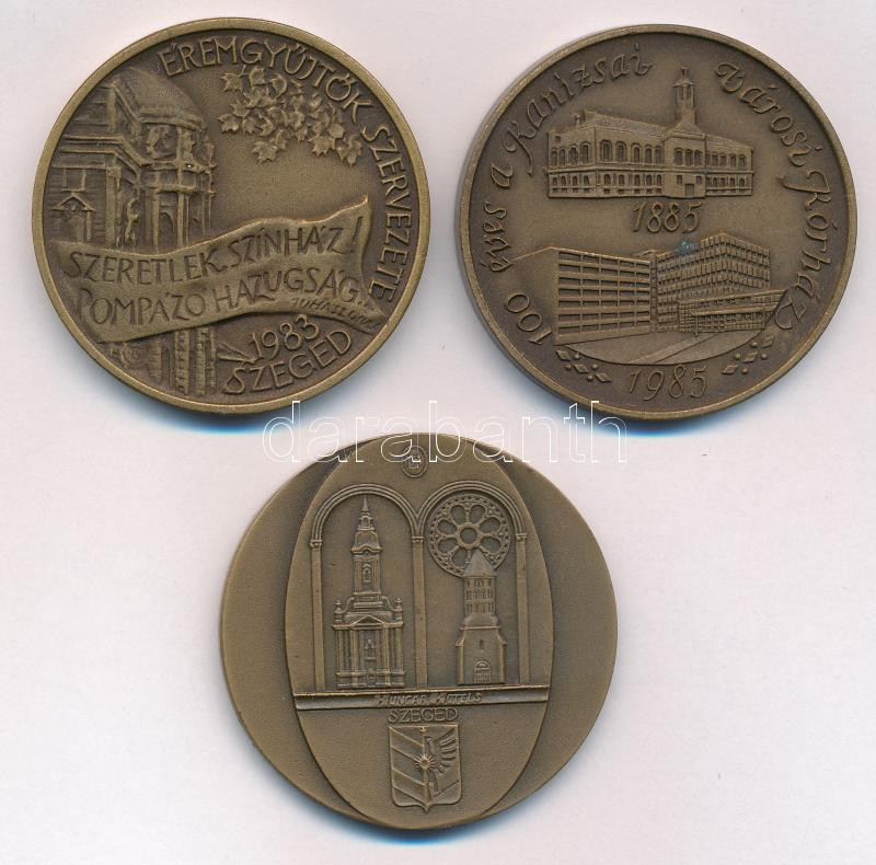 3db-os bronz emlékérem tétel, közte ‘Juhász Gyula, 100 éves a Kanizsai városi kórház, Hotel Royal – Szeged’ (42,5mm/db) T:1,1- patina<a href="https://www.darabanth.com/hu/gyorsarveres/436/kategoriak~Numizmatika/Magyar-emlekveretek-plakettek~1500009/