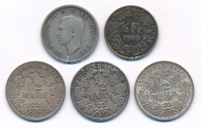 5db-os vegyes ezüst érmetétel, közte Nagy-Britannia 1938. 6p Ag ‘VI. György’ + Német Birodalom 1916. 1/2M Ag (3x) + Svájc 1909. 1/2Fr Ag T:2,2- patina 5pcs of mixed silver coin lot, in it Great Britain 1938. 6 Pence Ag ‘George VI’ + German