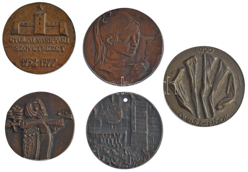 6 darabos magyar bronz emlékérem tétel, közte ‘Gyulai Vasipari Szövetkezet 1952-1977’ egyoldalas bronz emlékérem T:1-,2 egyik átfúrva, egyiken ragasztásnyom<a href="https://www.darabanth.com/hu/gyorsarveres/436/kategoriak~Numizmatika/Magyar-emlekver