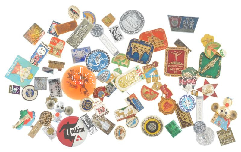 64 darabos vegyes jó állapotú nagyrészt szovjet kitűző tétel, közte műgyantás és zománcozott, műanyag, illetve elvétve tű nélküli darabok 64 pieces mixed resin, enamelled and plastic pin lot in good condition, some without needle, mainly from Soviet Union