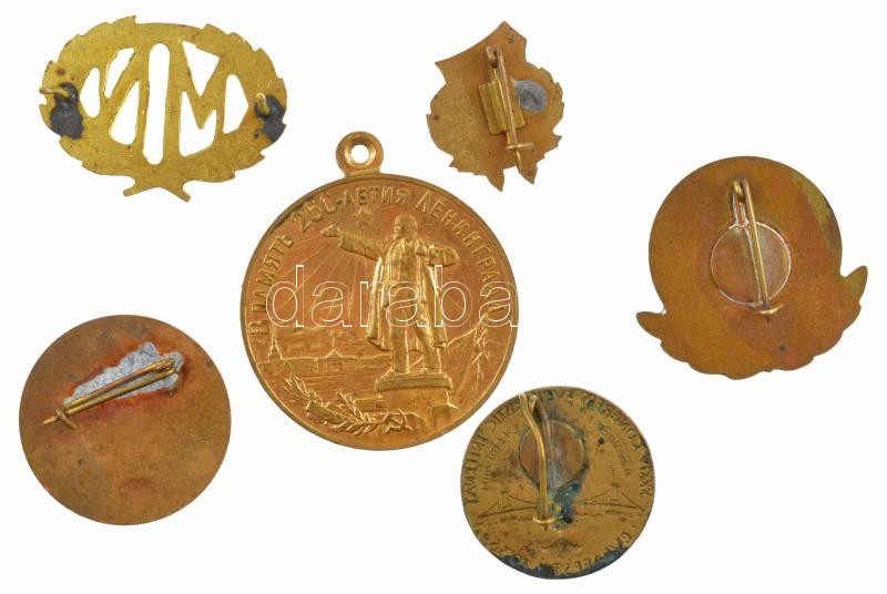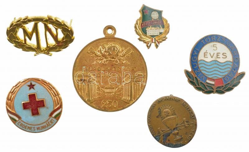 6db klf kitűző, jelvény tétel, közte Madarassy Walter (1909-1994) 1938. ‘XXXIV. Nemzetközi Eucharisztikus Kongresszus Budapest’ bronz kitűző + ‘Vöröskereszt – Érdemes Munkáért’ zománcozott fém jelvény + ~1970-1980. ‘Vízügyi Törzsgárda 5 éves’ zománcozott