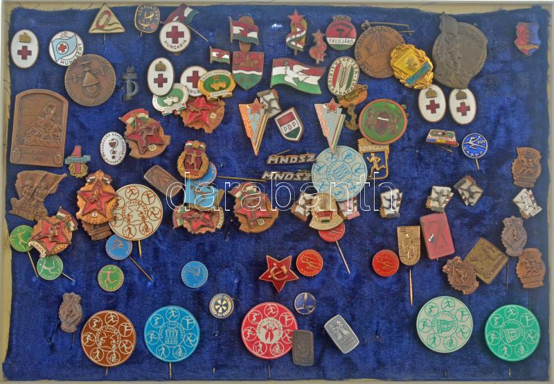 ~70-80 darabos vegyes jó állapotú magyar és külföldi kitűző tétel, közte műgyantás és zománcozott darabokkal, műanyag tálcán ~70-80 pieces mixed hungarian and foreign resin and enamelled pin lot in plastic tray<a href="https://www.darabanth.com/hu/g