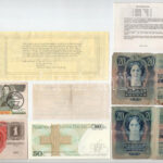 8db-os vegyes magyar és külföldi bankjegy, valamint sorsjegy és replika bankjegy tétel, közte Amerikai Egyesült Államok / Jersey / Jersey City 1865. 2$ hátoldalán jelzett gyűjtői másolat T:AU-VG közte szép papír, az egyik ragasztott