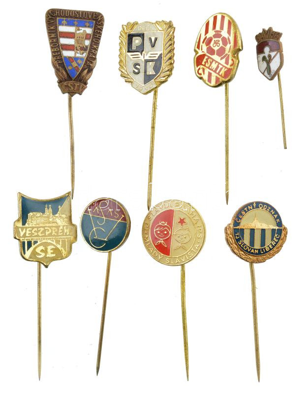8xklf magyar és külföldi labdarúgó jelvénytétel, benne: PVSK (Pécsi Vasutas SK), Gamma LSE, Vasas SC, ESMTK (Erzsébeti Spartacus Munkás TK), Veszprémi SE, Slavia Praha, Slovan Liberec, Košice (Kassa). Közte zománcozott darabok T:1-2 egyik tű sérült<