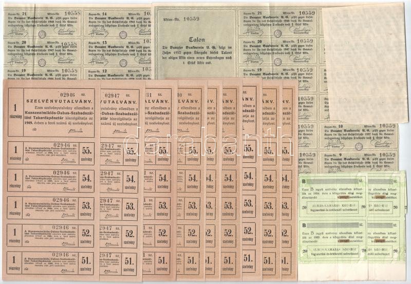 Almáskamarás 1934. ‘Almás-Kamarás Községi Fogyasztási és Értékesítő Szövetkezet’ B jegyű szelvényei (2x) + 1944. ‘Kunszentmiklós-Dabas-Szabadszállási Takarékpénztár’ részvényeihez tartozó szelvényutalványok (9x) közte sorszámkövetők is + Románia / Arad –