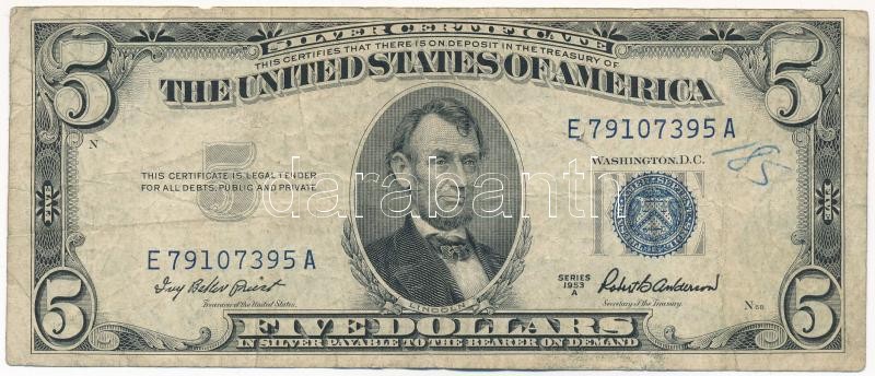 Amerikai Egyesült Államok 1957-1961. (1953B) 5$ ‘Silver Certificate – kisméretű’, kék pecsét, ‘Elizabeth Rudel Smith – C. Douglas Dillon’ T:III USA 1957-1961. (1953B) 5 Dollars ‘Silver Certificate – Small size’, blue seal, ‘Elizabeth Rudel Smith – C. Dou