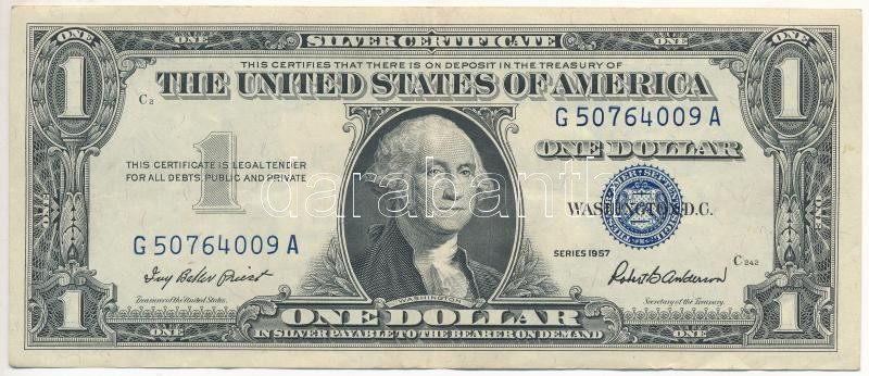 Amerikai Egyesült Államok 1957-1961. (1957) 1$ ‘Silver Certificate – kisméretű’, kék pecsét, ‘Ivy Baker Priest – Robert B. Anderson’ T:II USA 1957-1961. (1957) 1 Dollar ‘Silver Certificate – Small size’, blue seal, ‘Ivy Baker Priest – Robert B. Anderson’