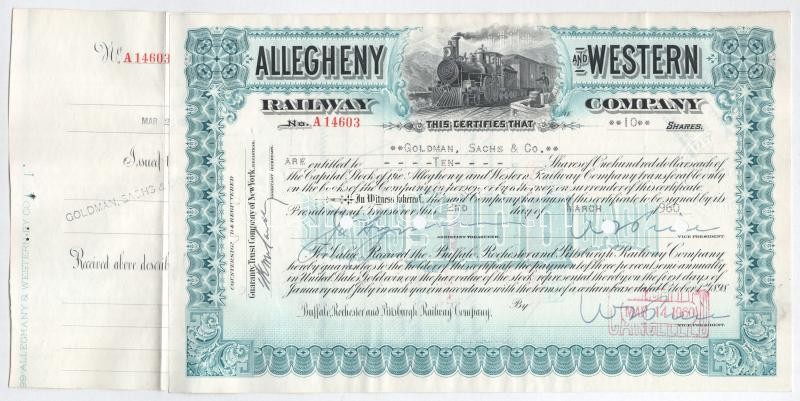 Amerikai Egyesült Államok 1960. ‘Allegheny and Western Railway Company’ névre szóló, tíz részvénye egyben, lyukasztással érvénytelenítve T:III szép papír USA 1960. ‘Allegheny and Western Railway Company’ share with shareholder’s name, ten shares in one, c