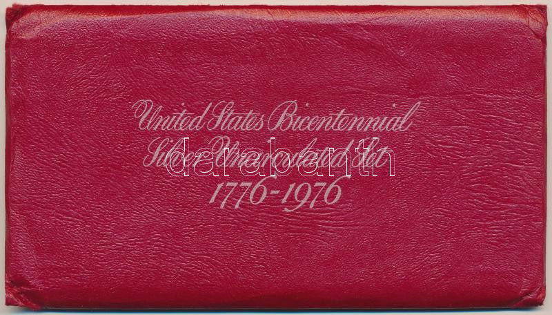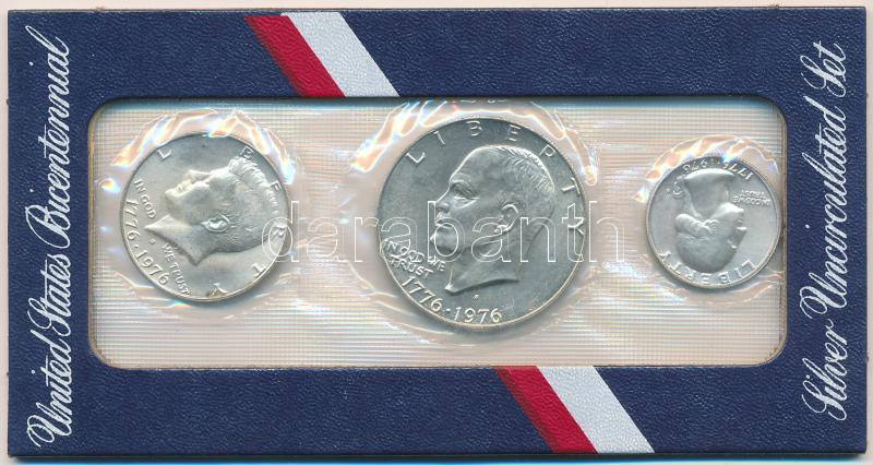 Amerikai Egyesült Államok 1976S 1/4$ Ag ‘Washington’ + 1/2$ Ag ‘Kennedy’ + 1$ Ag ‘Eisenhower’ ‘Bicentennial’ szettben, műanyag vákuum csomagolásban és karton keretben, angol nyelvű tájékoztatóval, eredeti piros műbőr borítékban T:UNC,AU kissé viseltes bor