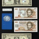 Amerikai Egyesült Államok 1985. 1$ (2x) „Federeal Reserve Note” kék pecsét, „Katherine Davalos Ortega – James Addison Baker” + Ausztria 1986. 20Sch (2x) mindegyik bankjegy hologramos felülbélyegzéssel, műanyag lapra ragasztva T:UNC,AU / USA 1985. 1 Dollar