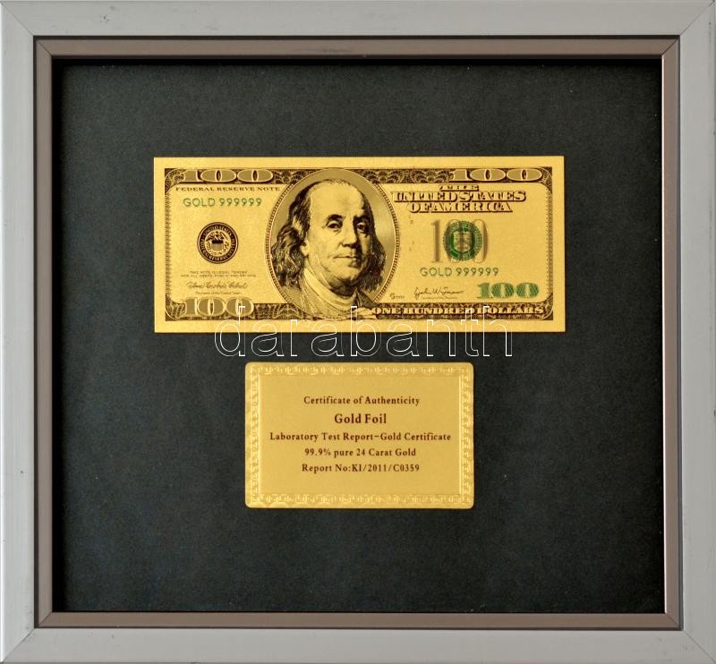 Amerikai Egyesült Államok 1999. 100$ ‘Federal Reserve Note’ aranyozott bankjegy replika, üvegezett keretben, tanúsítvánnyal T:I USA 1999. 100 Dollars ‘Federal Reserve Note’ gold plated banknote replica’ in glass frame with certificate C:UNC<a href="