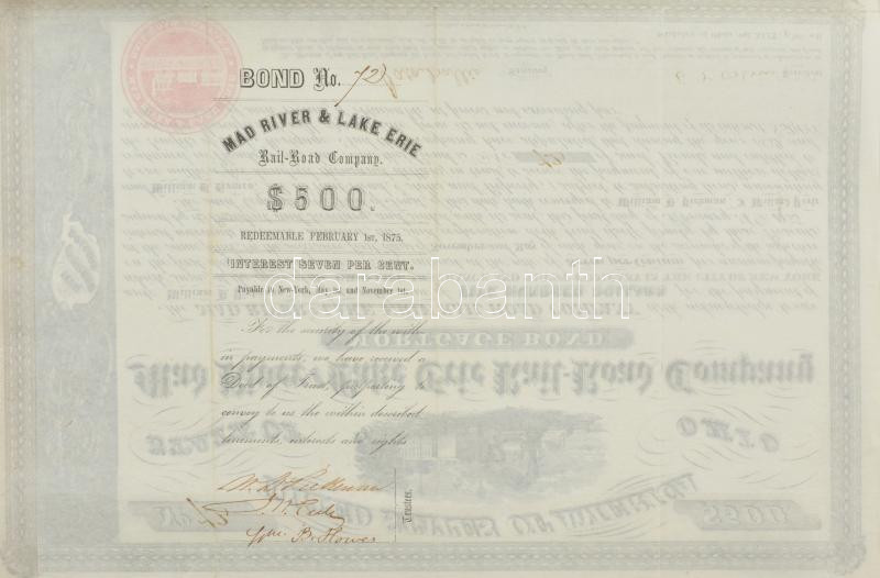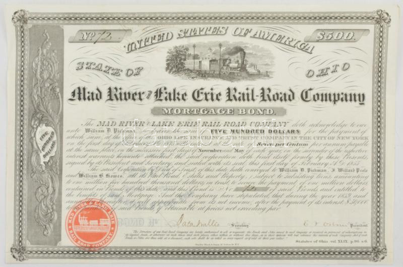 Amerikai Egyesült Államok / Ohio 1855. ‘Mad folyó and Erie tó Vasút Társaság’ 7%-os jelzálogkötvénye 500$-ról, szárazpecséttel, szelvényekkel, tanúsítvánnyal T:III felül kétoldalú ragasztóval kartonra rögzítve / USA / Ohio