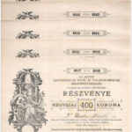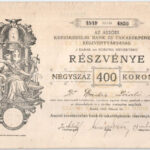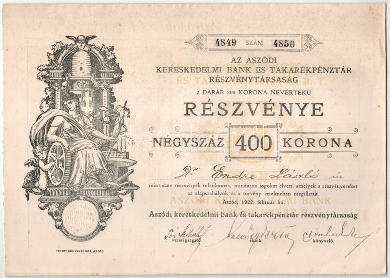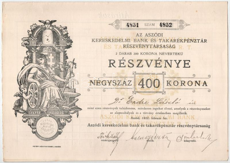 Aszód 1922. ‘Az Aszódi Kereskedelmi Bank és Takarékpénztár Részvénytársaság’ névre szóló részvénye összesen 400K-ról, sorszámkövetők, szárazbélyegzővel, szelvényekkel (5x) sorszámkövetők T:I-,II közte kis folt,