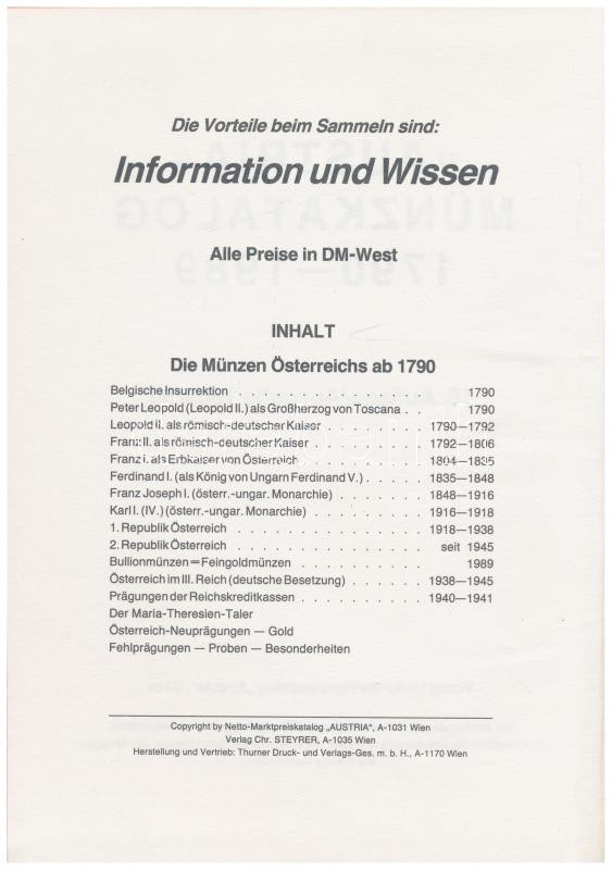 Austria Münzkatalog 1790-1989. Wien, Verlag Netto-Marktpreiskatalog. Egészvászon-kötés, használt, jó állapotban, a papír védőborító kissé kopott, szakadt.<a href="https://www.darabanth.com/hu/gyorsarveres/433/kategoriak~Numizmatika/Numizmatikai-irod