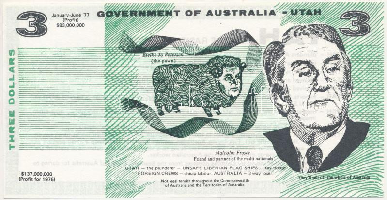 Ausztrália 1976. 3$ ‘Malcolm Fraser – UTAH’ gúnypénz T:I,I- Australia 1976. 3 Dollars ‘Malcolm Fraser – UTAH’ mock money C:UNC,AU<a href="https://www.darabanth.com/hu/gyorsarveres/432/kategoriak~Numizmatika/Papir-es-fem-szuksegpenzek~1500006/Ausztra