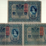 Ausztria 1919. (1902) 1000K (3x) függőleges ‘DEUTSCHÖSTERREICH’ felülbélyegzéssel, mindkét oldal német T:III kis szakadás Austria 1919. (1902) 1000 Kronen (3x) with vertical ‘DEUTSCHÖSTERREICH’ overprint, both sides in german C:F small