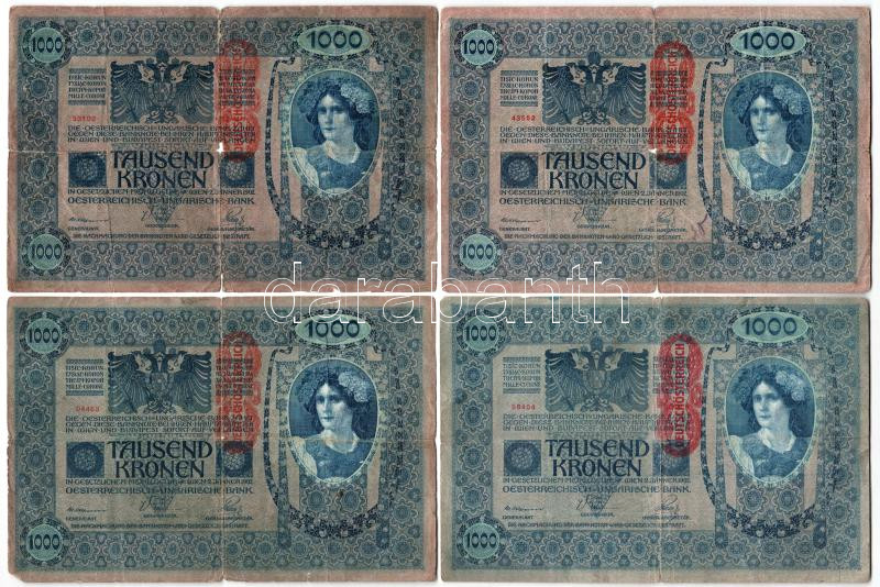Ausztria 1919 (1902) 1000K mindkét oldal német, piros ‘DEUTSCHÖSTERREICH’ függőleges felülbélyegzéssel (7db) + 1000K rajzos hátlap, piros ‘DEUTSCHÖSTERREICH’ vízszintes felülbélyegzéssel T:III- Austria 1902. 1000 Corona both sides