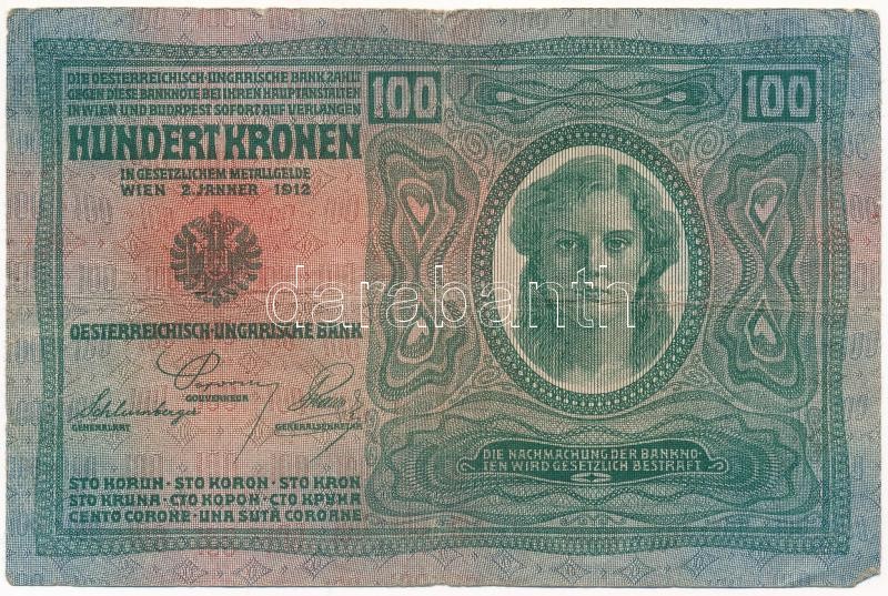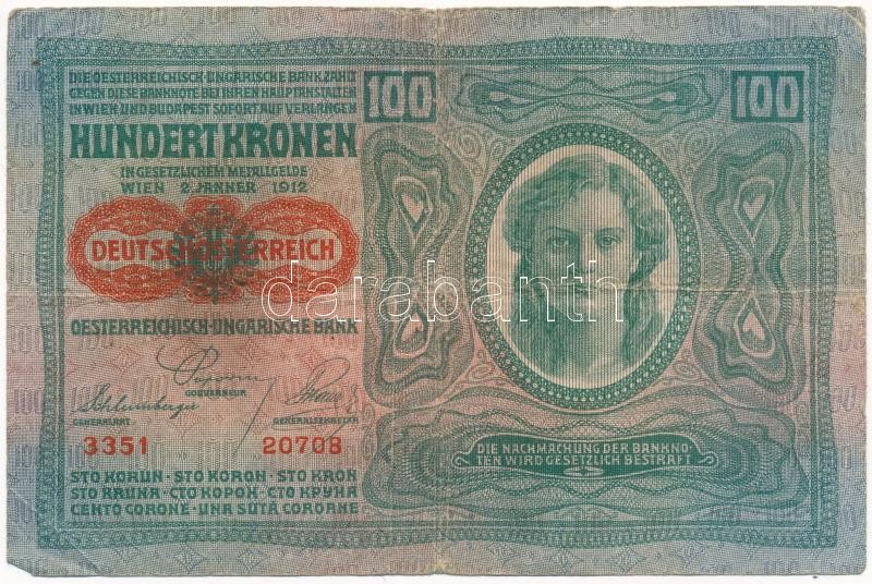 Ausztria 1919. (1912) 100K, vízszintes ‘DEUTSCHÖSTERREICH’ felülbélyegzéssel, mindkét oldal német T:III szakadás, kis anyaghiány Austria 1919. (1912) 100 Kronen, with horizontal ‘DEUTSCHÖSTERREICH’ overprint, both sides in german C:F